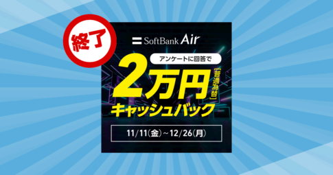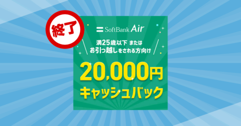 ソフトバンクエアー「SoftBank Air 新生活を快適に!2万円キャッシュバック」は2023年4月3日をもって終了しています。 2026年1月現在実施中のキャンペーンはソフトバンクエアーのキャンペーンの比較方法という記事にてご確認くだ...