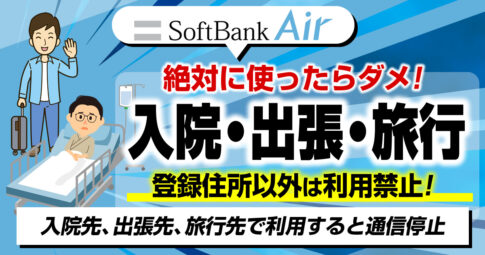 ソフトバンクエアーソフトバンクエアー(SoftBank Air)は入院先の病室や旅行先・出張先のホテルなどで利用してもよいのかをお調べですね。 ソフトバンクエアーは携帯電話と同じように「電波」を受信してインターネットに接続するサービスなの...