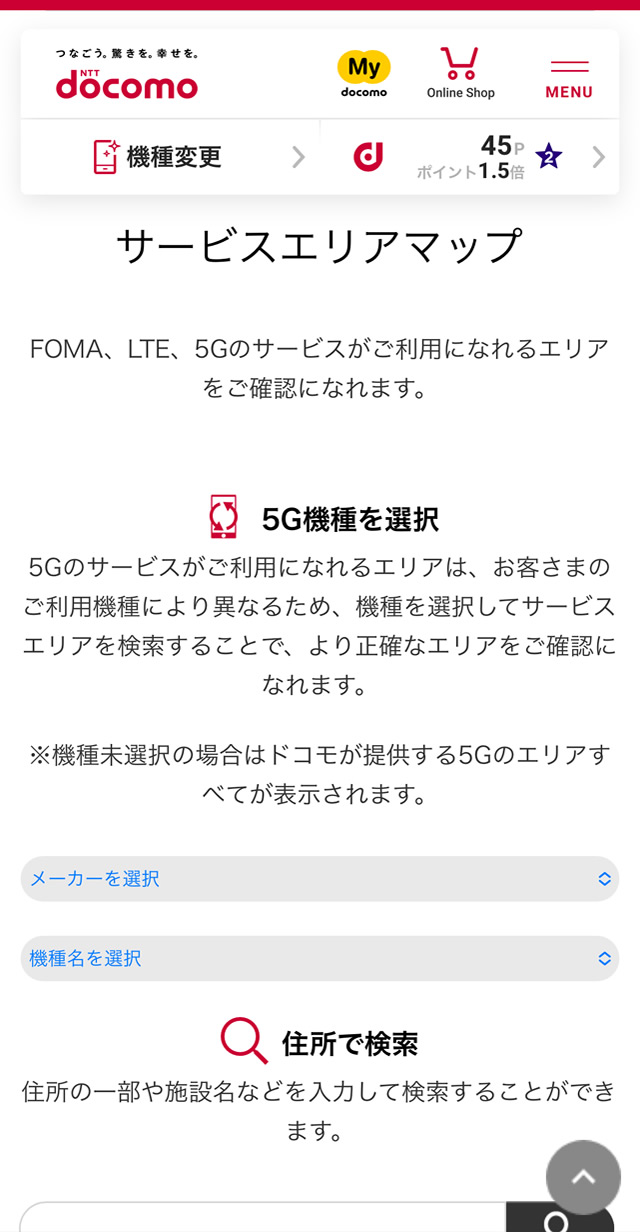 まずは、ドコモ公式サイトにある「サービスエリアマップ」ページへアクセスします。