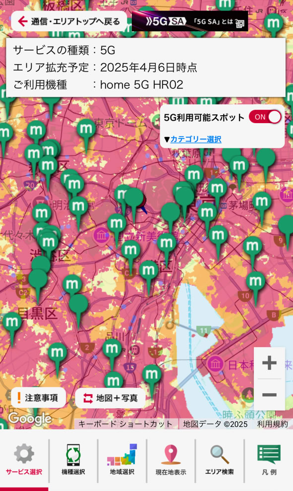 緑のピンが邪魔なので「5G利用可能スポット」を選択してONからOFFにします。