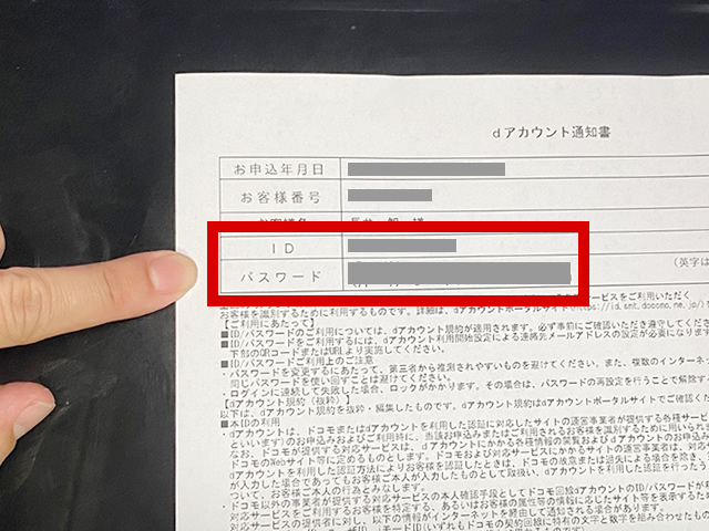 home 5Gを契約時に自動で発行されたdアカウントの利用開始設定には、dアカウント通知書に記載されている「ID」と「パスワード」が必要となりますので事前に準備します。