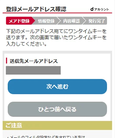 dアカウントに登録するメールアドレスに間違いがなければ登録するボタンを押します。