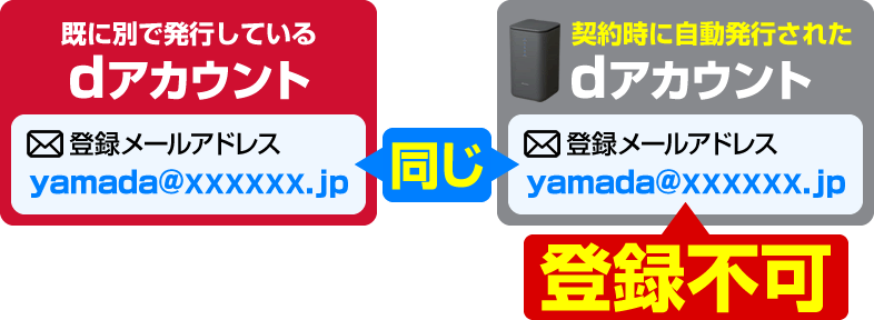 例えば、home 5G契約前に既に発行しているdアカウントに「yamada@xxxxx.jp」というメールアドレスを登録済みの場合、home 5G契約時に自動発行されたdアカウントに同じメールアドレスの「yamada@xxxxx.jp」を登録できません。
