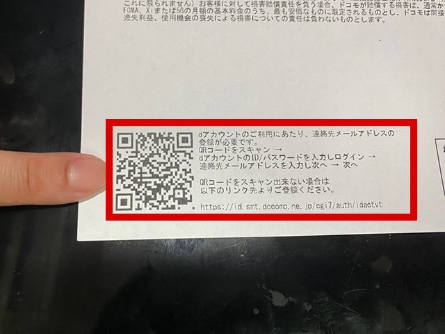 「dアカウント通知書」の下にあるQRコードからhome 5Gを契約時に自動で発行されたdアカウントにアクセスします。(QRコードを利用できない場合はこちら)