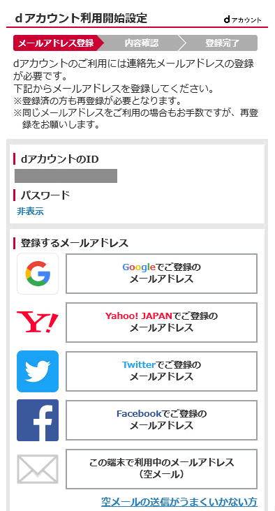 dアカウントにメールアドレスを登録するには大きく分けると3つの方法があります。