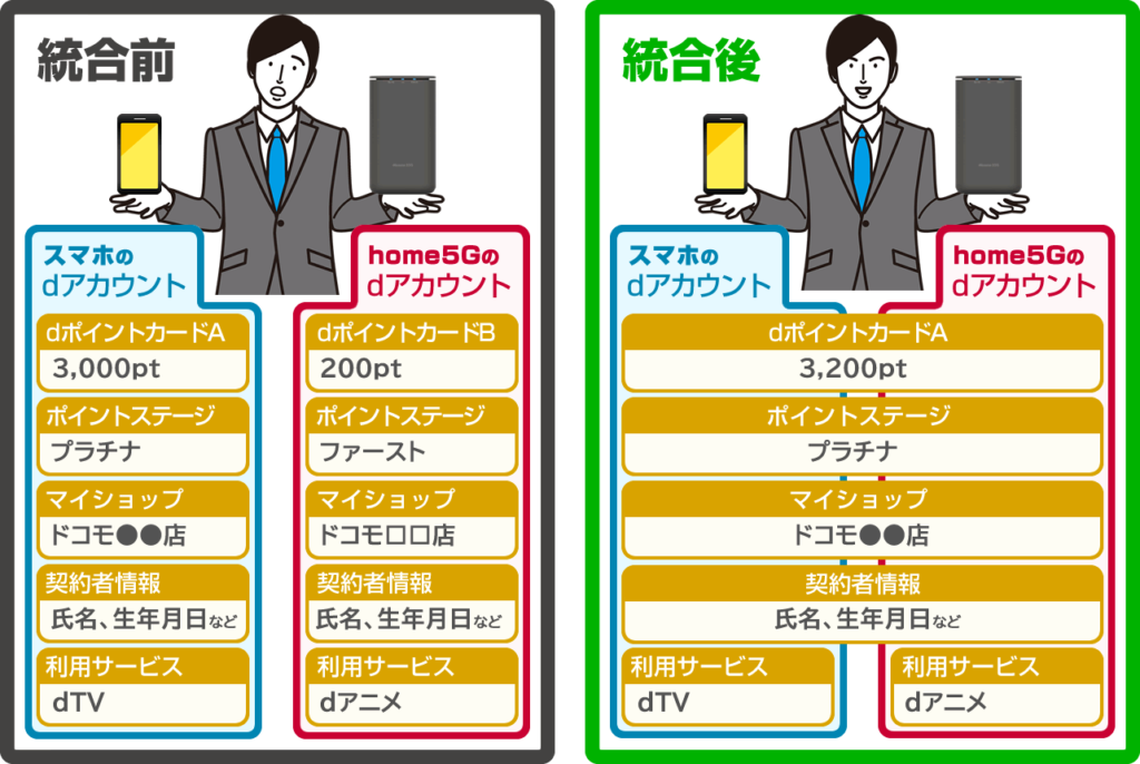 例えば、統合される側の携帯電話のdアカウントのポイントカードを「A」、home 5Gのdアカウントをポイントカードを「B」とした場合、統合により携帯電話のポイントカード「A」にhome 5Gのポイントが合算されます。