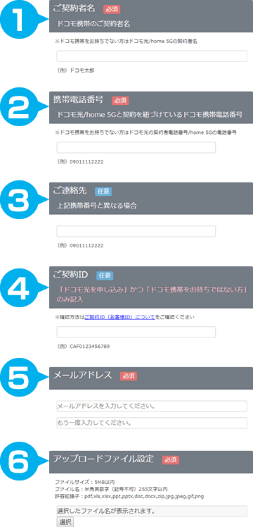 ドコモから連絡がある場合に電話をして欲しい携帯番号を入力します。 - ご契約ID: