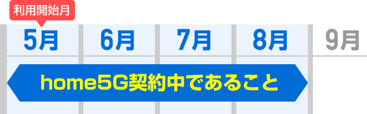 home 5Gの利用開始月が「5月」の場合は、4ヶ月後の月末である「8月31日まで」home 5Gを解約せずに継続して契約していることも条件となります。
