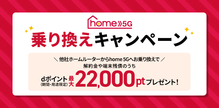 他社ホームルーターの解約金や端末残債に応じてdポイントが最大22,000ptまでプレゼントされるので、実質少ない負担で速度が安定して速いhome 5Gへ乗り換えられる”違約金補填”のキャンペーンとなっています。