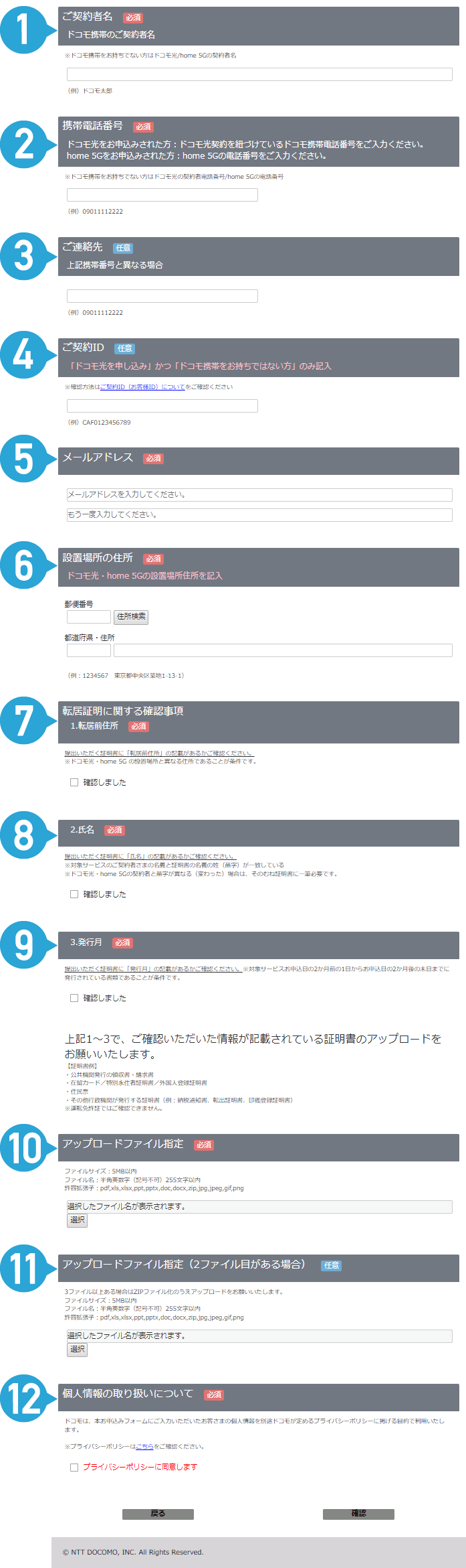 home5Gの申込時に登録した設置場所住所を入力する - 転居証明に関する確認事項(1.転居前住所)