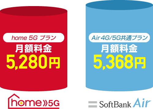| 月額料金 | home 5G プラン 5,280円 | Air 4G/5G共通プラン 5,368円 |