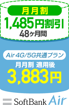 2026年1月現在、ソフトバンクエアーを申し込む際に使用する専用ルーター「Airターミナル6」を購入契約すると、48ヶ月間は料金プラン(Air 4G/5G共通プラン)から1,485円割引される「月月割(Airターミナル6)」の適用により48ヶ月目まで月額料金は3,883円となります。