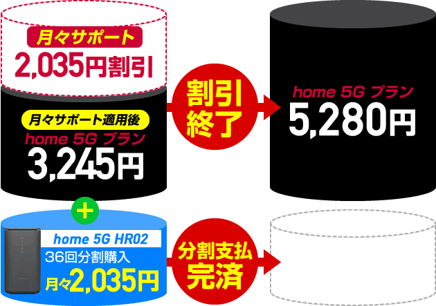 home 5Gの専用ルーター「home 5G HR02」を36回分割購入した場合、36ヶ月間は「月々サポート(2,035円割引)」の適用により月額料金が3,245円となります。