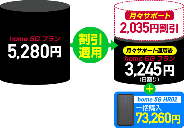 | 割引額 | home 5G HR01の場合 月々1,100円割引 home 5G HR02の場合 月々2,035円割引 |