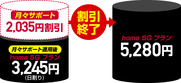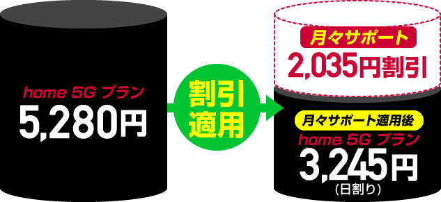 ドコモ home 5Gの契約月(1ヶ月目)は「home 5G プラン」の月額料金5,280円から月々サポート(2,035円割引)が適用されて月額料金は3,245円が請求されます。