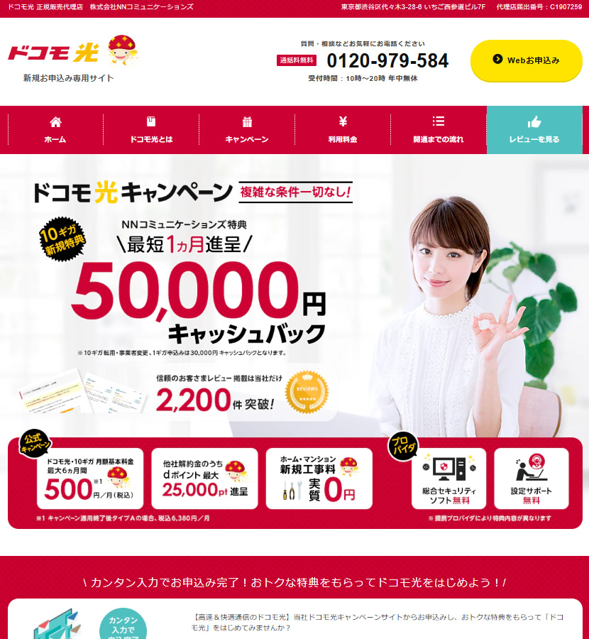 2026年1月現在、NTTドコモの正規代理店である株式会社NNコミュニケーションズが自社運営する申込受付サイト経由でドコモ光のインターネット契約をすると、正規代理店限定特典として最大50,000円キャッシュバックを受け取れます。