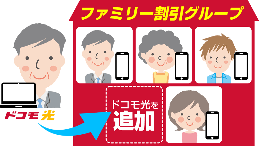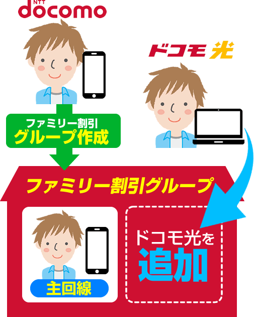 ドコモ光の契約者がファミリー割引のグループ代表(主回線)の場合は、電話やドコモショップで簡単にドコモ光の契約をファミリー割引のグループに追加でき、ドコモ光セット割が適用されるようになります。