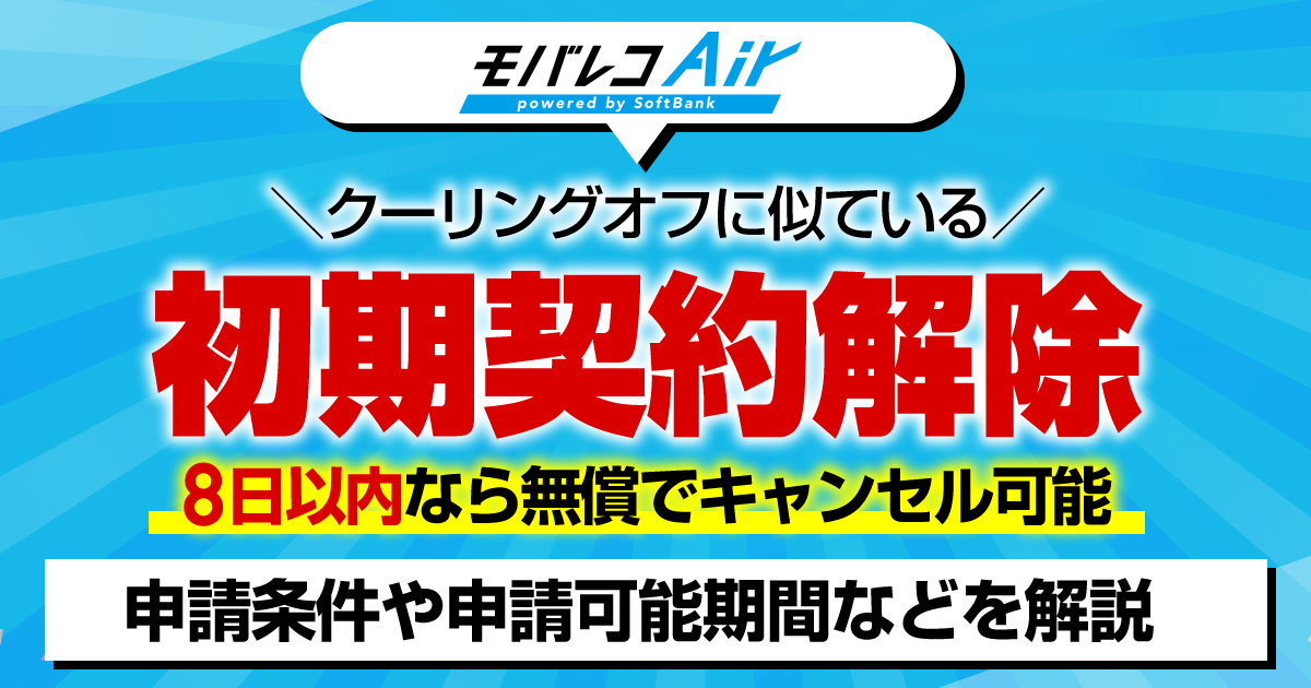 この記事ではモバレコAirをクーリングオフに似ている初期契約解除で契約をキャンセル(取り消し)する条件や申請可能な期間、キャンセルされる契約内容、初期契約解除でキャンセルしても支払いが発生するもの、そして、初期契約解除の手続きの流れを解説しました。