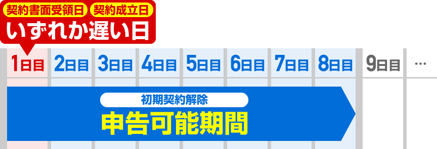 モバレコAirを初期契約解除できる期間は[契約書面受領日][契約成立日]のいずれか遅い日を1日目として8日目までです。(9日目以降は通常通りの解約となりますのでご注意ください。)