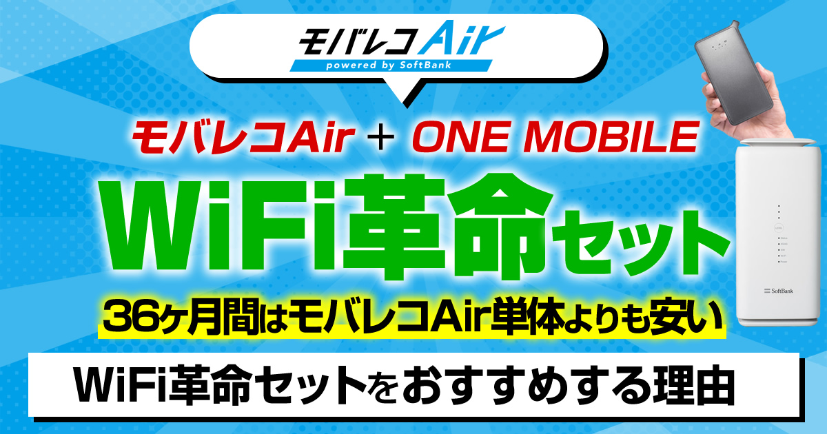 WiFi革命セットは「モバレコAir(SoftBank Air+GLプレミアムメンバーズ)」と「ONE MOBILE」の2つのサービスが1つの契約で可能なセットサービス名です。