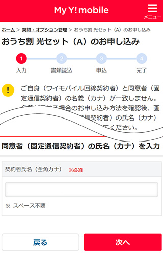 「同意者(固定通信契約者)の氏名(カナ)を入力」という項目では、モバレコAirの契約者の氏名を全角カタカナで正しく入力して[次へ]ボタンを押します。(氏名のスペースは不要です。)