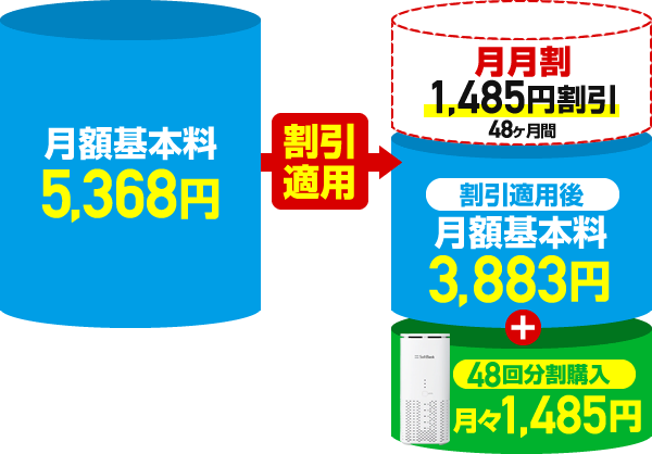 割引適用後の月額基本料金(3,883円)に48回分割購入した支払い額(1,485円)が合算されて請求されるため、毎月の請求額は5,368円となります。(元々の月額基本料金と同額となります。)
