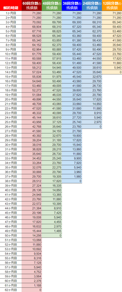 または、12回分の残債額23,760円(1,980円×12回分)を解約後に一括で支払うことも可能です。