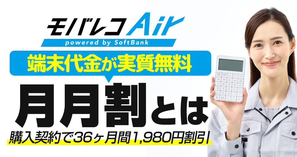 モバレコAirでは端末代金が実質無料となる「月月割」という割引特典があります。