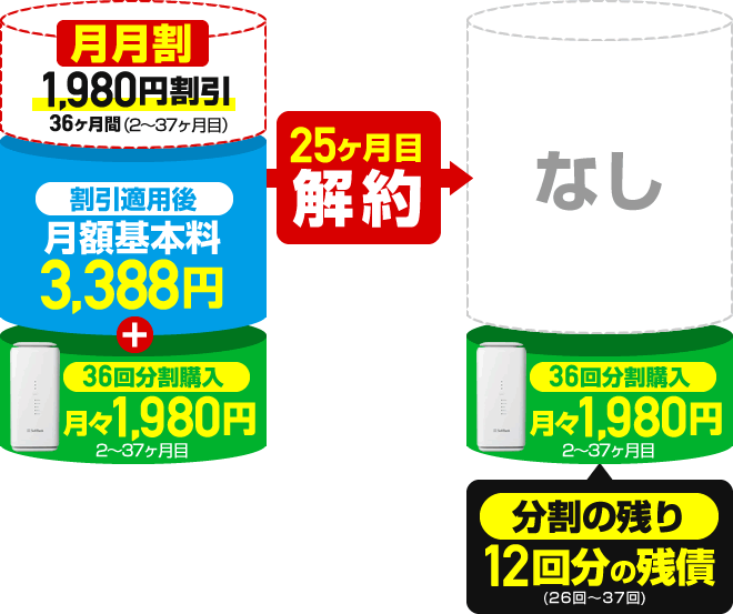 しかし、25ヶ月目に解約した場合は「26回~37回」の12回分の残債(分割の残り)がある状態となっていますので、解約後も12ヶ月間は月々1,980円を支払い続けて端末代金を完済する必要があります。