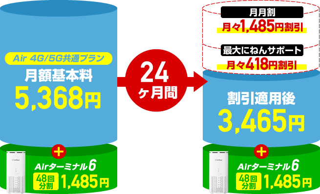 ソフトバンクエアーを新規契約する際にAirターミナル6を一括又は分割で購入契約すると、ソフトバンクエアーの月額基本料(インターネット利用料)から48ヶ月間1,485円が割引となる「月月割(Airターミナル6)」が適用されます。