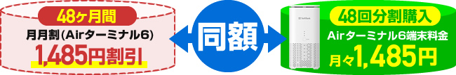 | 月月割 (Airターミナル6) | 1,485円割引 ×48ヶ月間 | 1,485円割引 ×48ヶ月間 |
