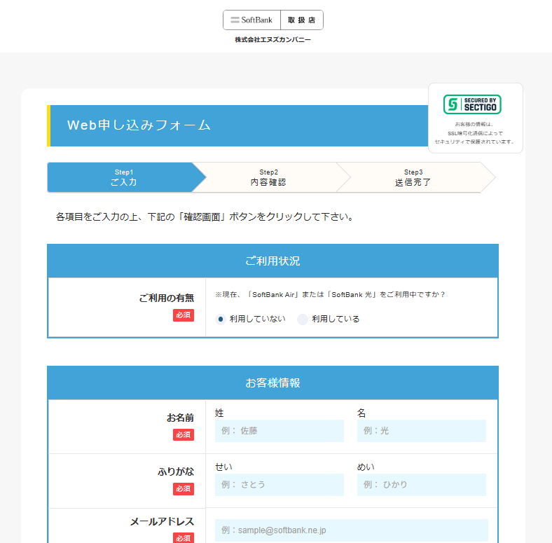 以下、ソフトバンクエアーを申し込み後に最大50,000円キャッシュバックが受け取れる正規代理店エヌズカンパニーのWebサイトでの申し込みの流れを簡単に解説します。