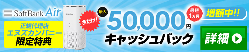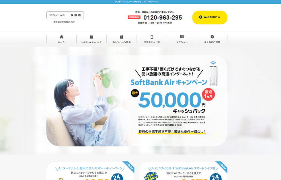 2026年2月現在、下記のリンクからソフトバンクエアーの正規代理店であり契約者特典として最大50,000円キャッシュバックを提供する正規代理店エヌズカンパニーのWebサイトへアクセスできます。