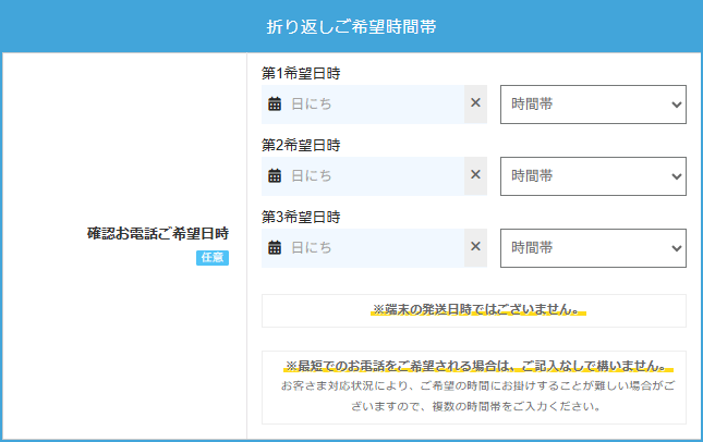 「ご連絡希望について」では、申し込み内容の確認電話のため正規代理店エヌズカンパニーの受付担当者より電話をして欲しい(または電話に出やすい)日時を選択します。(なるべく早く連絡が欲しい場合は希望時間帯を全部選択して、希望曜日を”いつでも”を選択しましょう。)