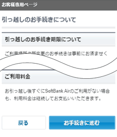My SoftBankの引越し手続きページにアクセスしてログインすると上記画像のように「引っ越しのお手続きについて」という画面にアクセスできますので、注意事項などを読んでからお手続きに進むボタンを押してください。
