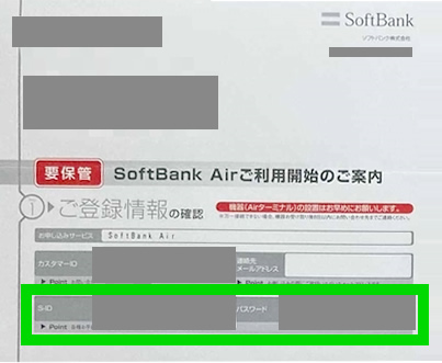 「ご利用開始のご案内」という書面が見当たらない場合、ソフトバンクエアーを契約後に登録した携帯電話のSMS(ショートメール)で「ご利用開始のご案内」というメールがSoftBankから送られてきています。そのメールに記載のURLへアクセスして手続きを行うと「S-ID」等を確認できます。