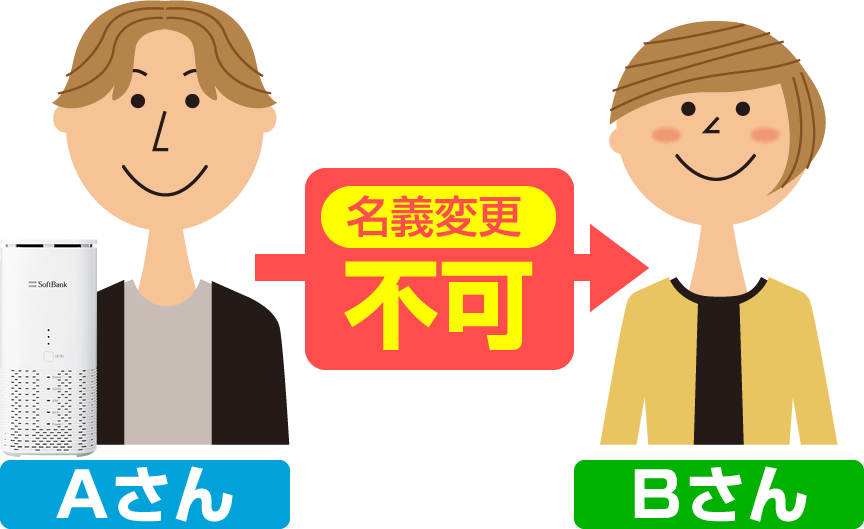 例えば、上記イラストのようにソフトバンクエアーの契約者である「Aさん」から「Bさん」へ名義変更(譲渡)することはいかなる理由であっても一切認められていません。