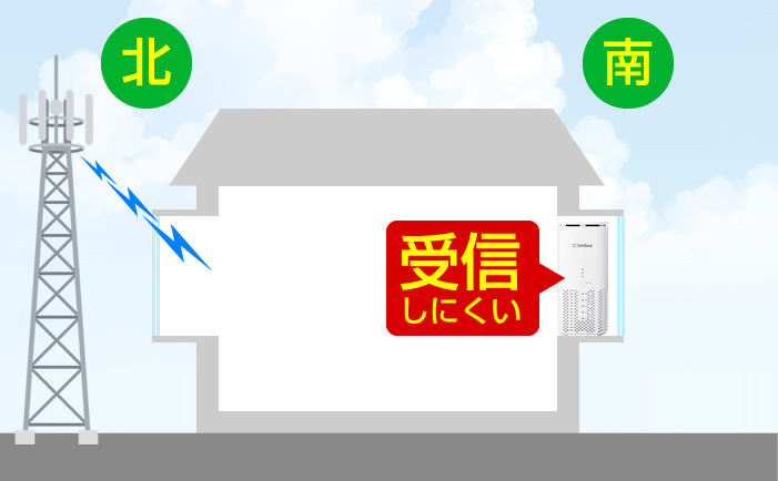 もし、基地局(電波塔)が北側にあるにも関わらず反対方向の南側の窓際に設置してしまうと電波が受信しづらく受信感度も非常に悪くなるため速度低下などの問題が発生します。