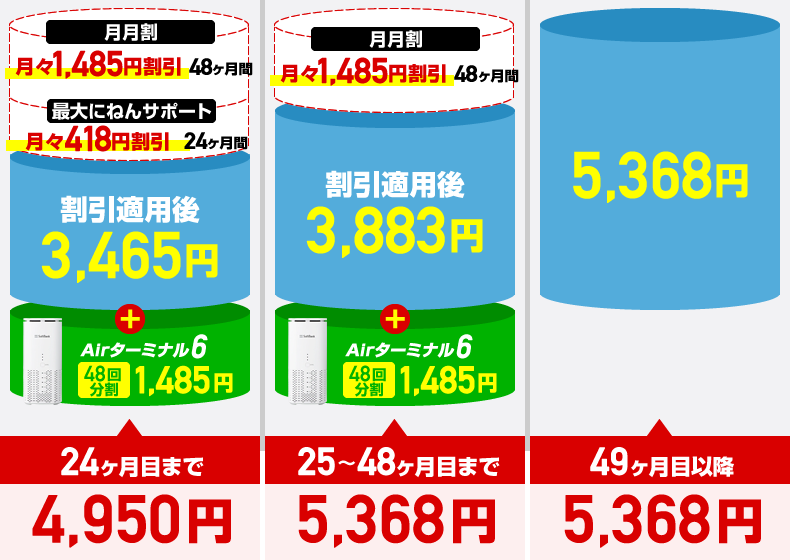 割引された月額基本料金(3,465円)に「Airターミナル6」の48回分割支払い額(1,485円)が加算されるため、24ヶ月目までは月額4,950円・25ヶ月目以降は月額5,368円の請求額となります。