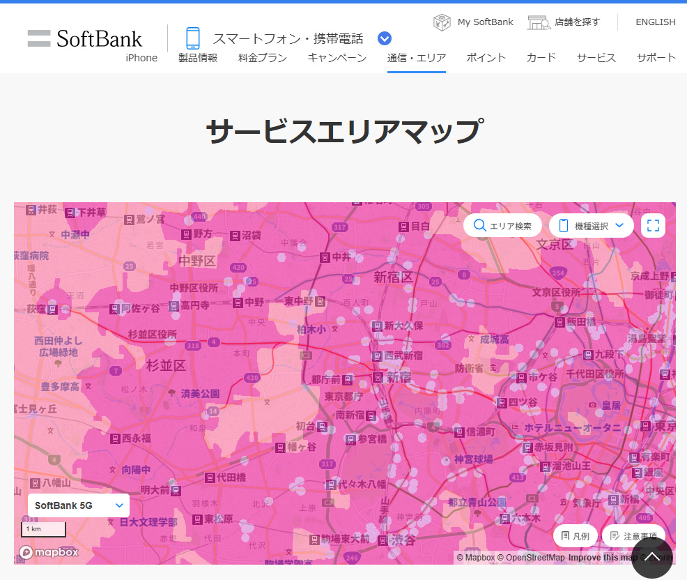 SoftBank公式サイトの「サービスマップ」ページで提供エリアを確認できますが、1つ注意が必要です。