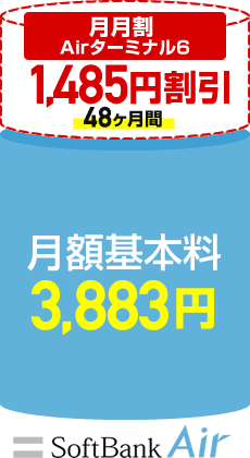 2026年1月現在、ソフトバンクエアーで使用する端末[Airターミナル6]を購入契約すると48ヶ月間は月額基本料金から1,485円が割引される「月月割 Airターミナル6」が適用されて48ヶ月間の月額基本料金は3,883円となります。