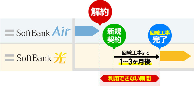 「サービス変更」による乗り換えの場合はソフトバンク光が利用できるまで(回線工事が完了するまで)はソフトバンクエアーが利用できるのでインターネットが利用できない期間は発生しません。