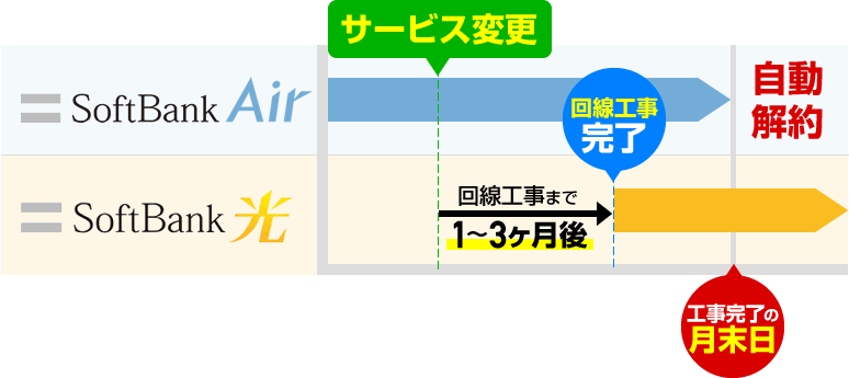 ソフトバンクエアーからソフトバンク光へ「サービス変更」による乗り換えの場合、ソフトバンク光の回線工事が実施された月の末日までソフトバンクエアーが利用できます。(回線工事が完了した月の末日にソフトバンクエアーが自動解約される。)