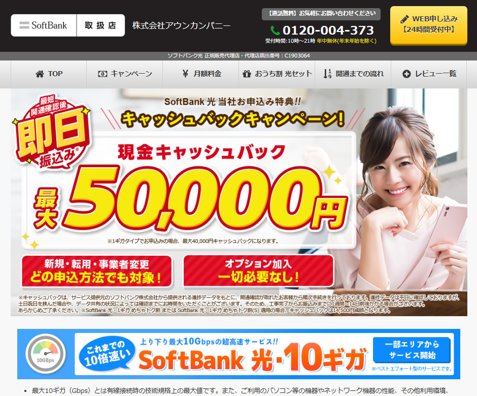 正規代理店アウンカンパニーが自社運営する申込受付サイト経由でソフトバンク光を契約すると、正規代理店アウンカンパニーの限定特典である最大50,000円キャッシュバックを受け取ることができます。