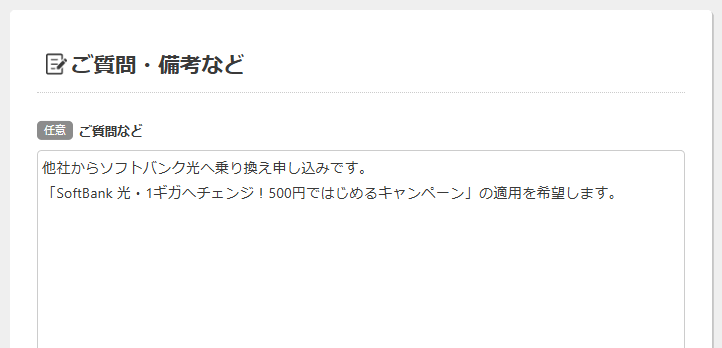 「SoftBank 光・1ギガへチェンジ!500円ではじめるキャンペーン」はソフトバンク光の契約申し込みと同時にキャンペーンの申し込みも必要となりますので、この[ご質問等]の項目に「他社から乗り換える申し込みである」こと、「キャンペーンを適用したい」ことなどを入力してキャンペーン適用希望を連絡しておきましょう。