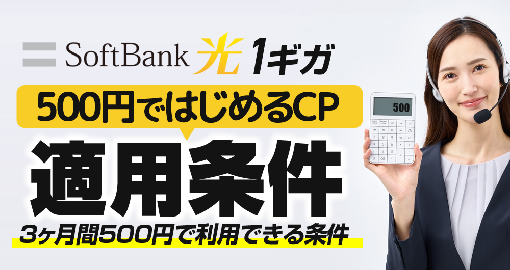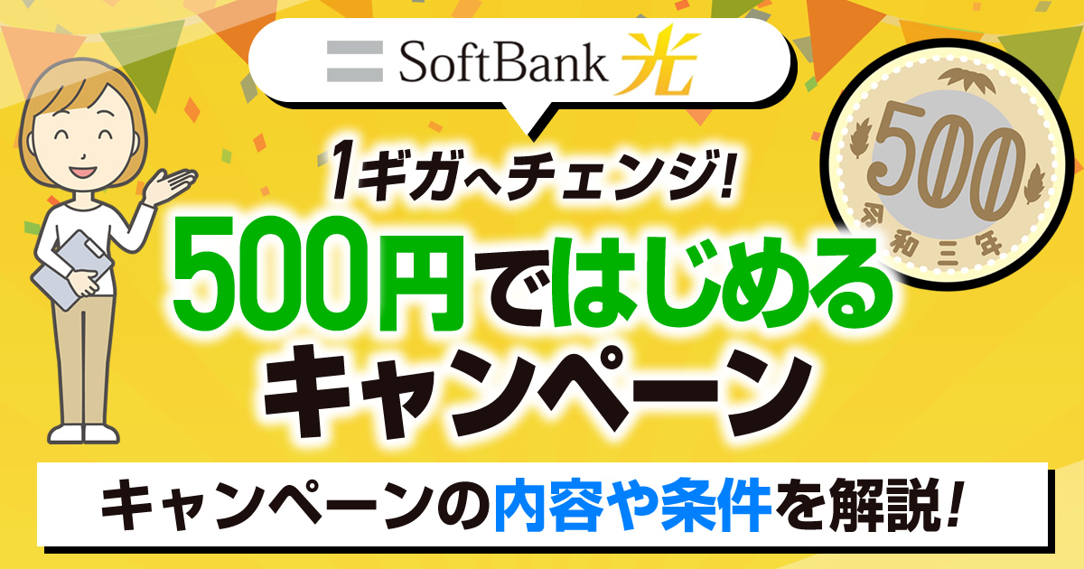 「SoftBank 光・1ギガへチェンジ!500円ではじめるキャンペーン」他社インターネット回線を契約中の方で[ソフトバンク光 1ギガ]へ新規・転用・事業者変更のいずれかの方法で乗り換える方を対象としたSoftBank公式キャンペーンで、ソフトバンク光でインターネットが利用可能となった日が属する月(課金開始月)を含む3ヶ月間は月額500円で利用可能となります。