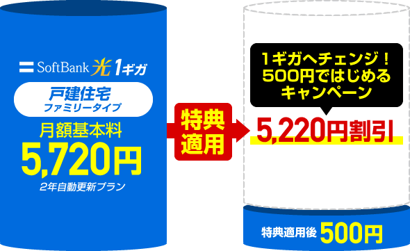 戸建住宅(ファミリータイプ)でソフトバンク光 1ギガを「2年自動更新プラン」で契約した場合は月額基本料5,720円ですが、「SoftBank 光・1ギガへチェンジ!500円ではじめるキャンペーン」の適用により3ヶ月間は5,220円が割引されて月額500円となります。