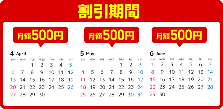 - 課金開始月を含む3ヶ月間は月額500円で利用できる