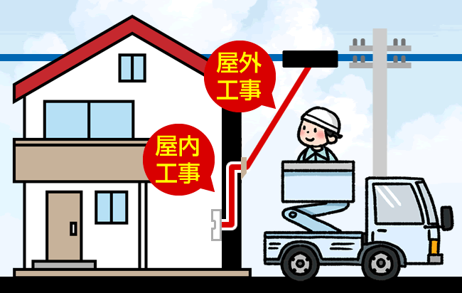 ソフトバンク光 1ギガの戸建住宅(ファミリータイプ)を[新規]で契約した場合、電柱から契約した建物まで光回線を繋げる「屋外工事」と、建物まで繋がった光回線を建物内へ引き込む「屋内工事」が実施されます。