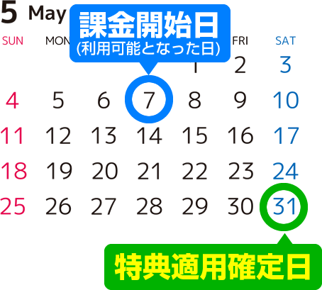 課金開始月の末日である[5月31日]が特典適用確定日となり、[5月31日]までに上記の3つのいずれかの支払い方法を登録しておくことも適用条件となっています。